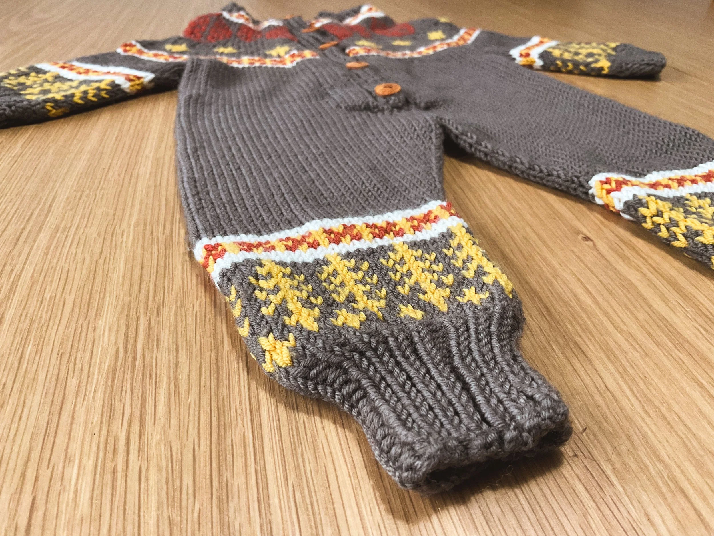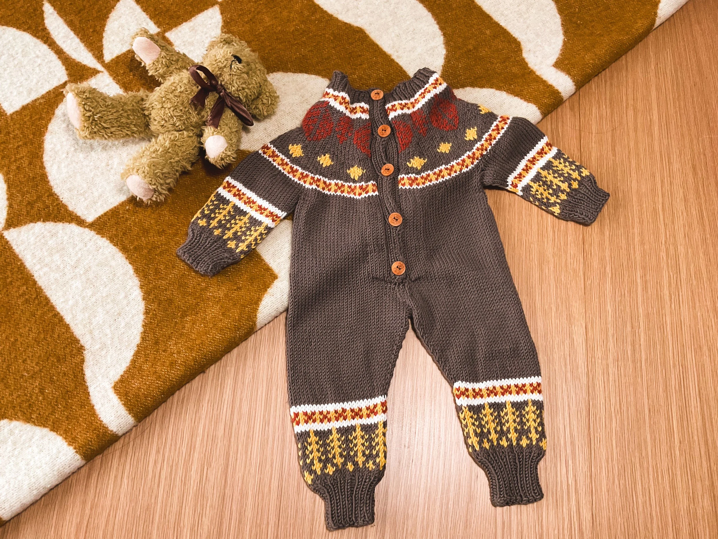 This sweet jumper features a dark brown tractor motif around the yoke on a deep beige base.